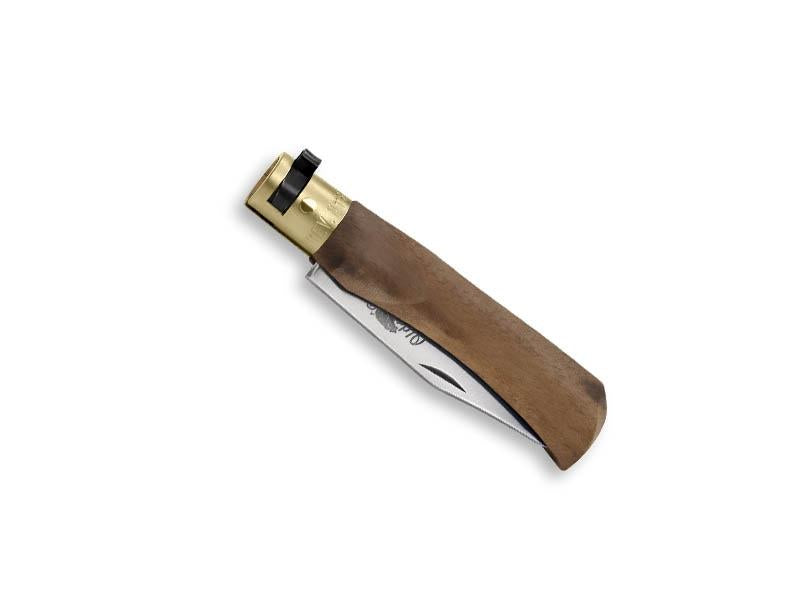 OLD BEAR „Oby – Junior“ Messer mit runder Spitze, 1.4060 Stahl, mit Sicherheitszwinge aus gebürstetem Messing (offene/geschlossene Position), 10 cm langer Griff aus ölbehandeltem Walnussholz.