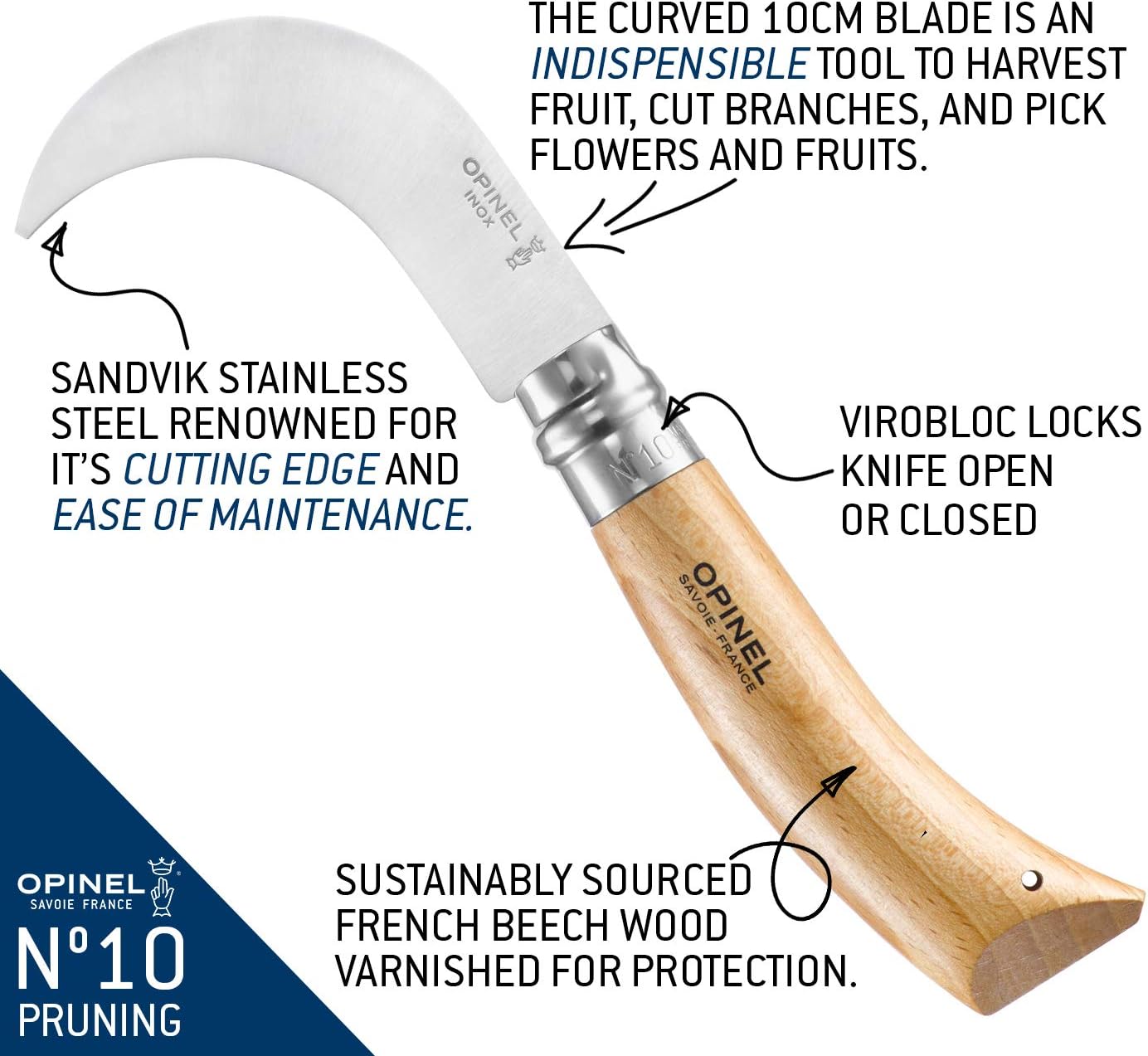 Serpeta Opinel št. 10 VRI je velik model v vrsti orodij za vrtnarjenje Opinel. Njeno ukrivljeno rezilo iz visokokakovostnega nerjavečega jekla dolžine 10 cm je namenjeno zahtevnim opravilom: obrezovanju tankih vej, trgatvi, nabiranju cvetja ali spravilu velikih gob. Njena izrazita ukrivljenost omogoča čist rez z zanesljivim in učinkovitim gibom.